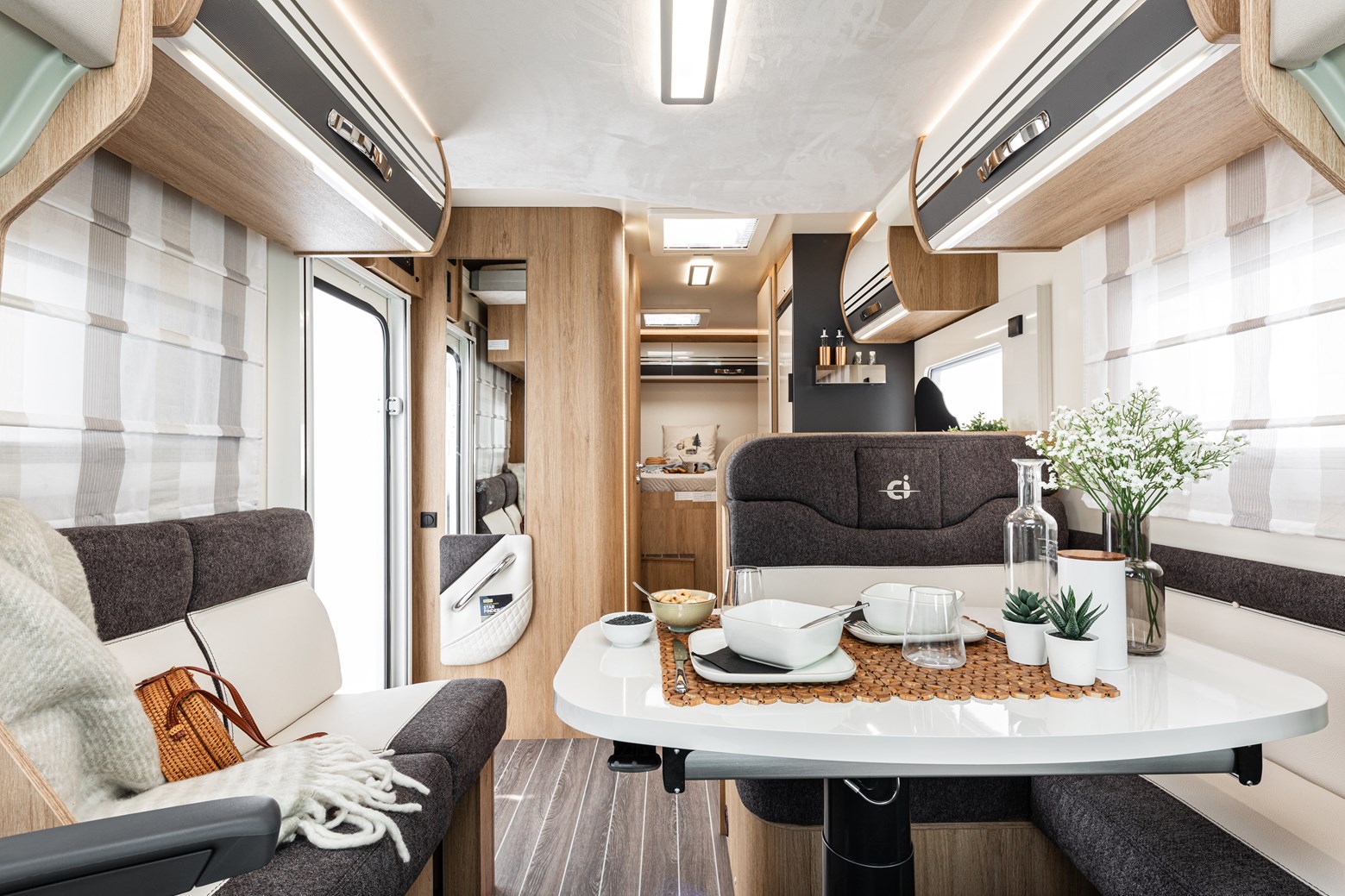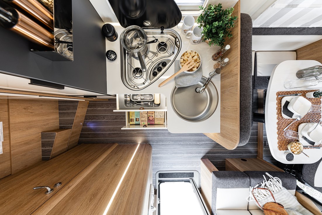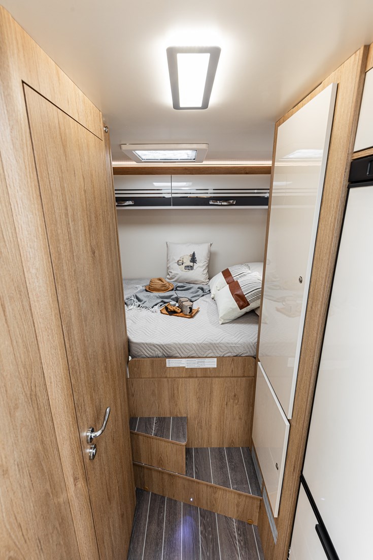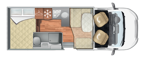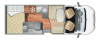 Questo camper è omologato con 5 posti viaggio. Può ospitare fino a 5 persone nella cellula abitativa, infatti è formato da un letto matrimoniale basculante elettrico da 190X128(107), un letto matrimoniale in coda da 207X135(120), ed una dinette trasformabile da 1 posto letto da 216X90(50). Porta del garage da 128X100. Dimensioni esterne di 6,99mt di lunghezza, 2,35mt di larghezza e 3,4mt di altezza.